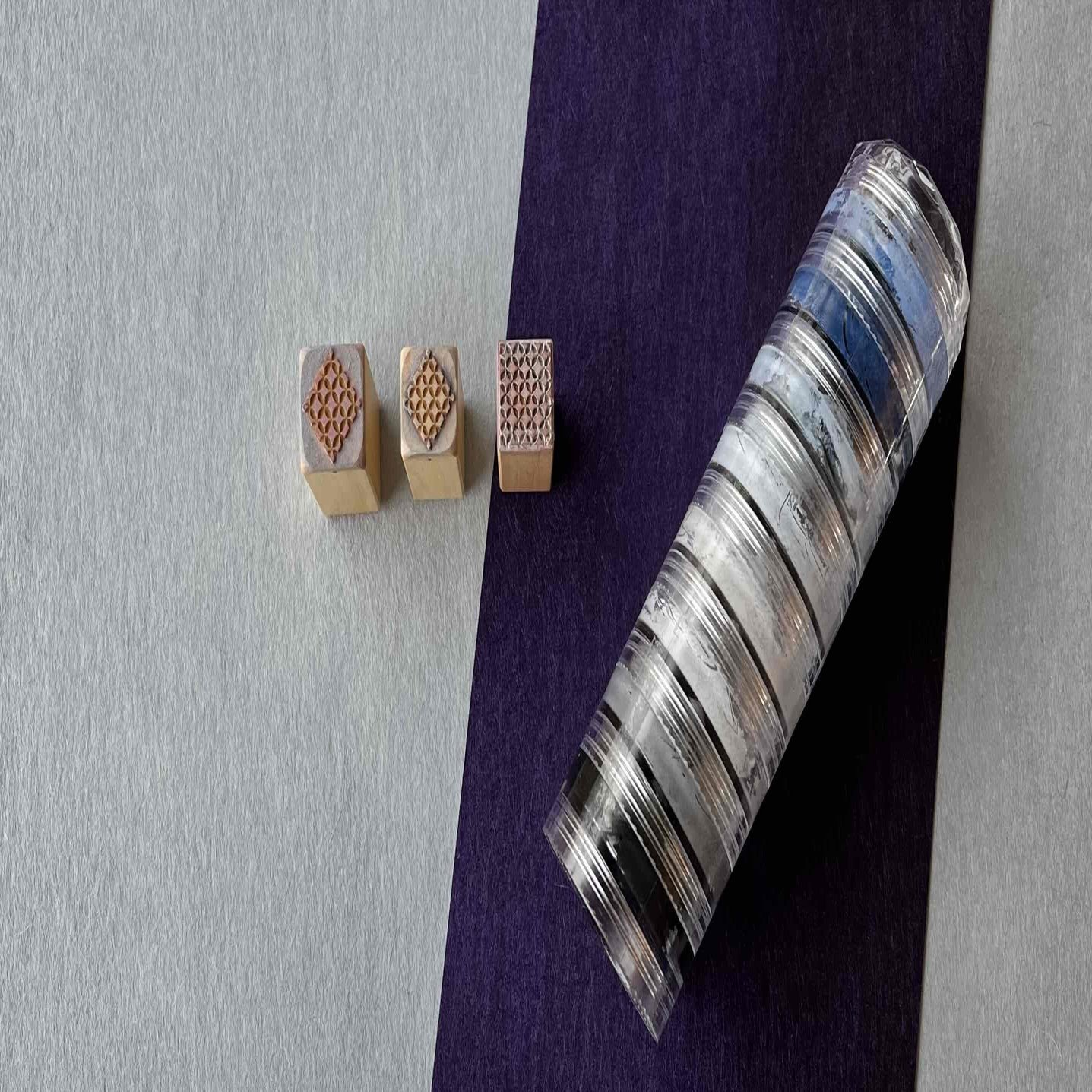 右のケースは黒~鼠色の濃淡~紺と白をたっぷり含んだ青の自作色印肉。