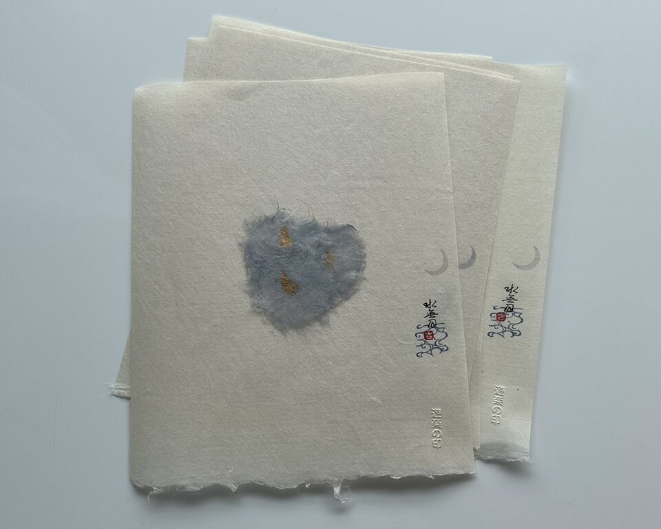 水無月のご縁 2023年06月01日 水無月にはいりました。梅雨時でもありますし、雨とか曇りとか。。。冬の空とは違う明るめの灰色と、暗めの水色のイメージが浮かびます。画像の文香には、墨染めの半紙を仕込んで、白い和紙に少し陰影を出したつもり。実は後ろ姿を気に入っています。^^ご覧いただけないかもしれませんが、「福」遊印を背負った水無月のご縁です。和月名の印を捺すとなんとなくかっこよくなる。笑根拠は示せませんがそう思います。合わせようと思っている和紙封緘紙は、青みがかった灰色。「皮鉄」という色を基本に作った色です。くすんだ色味の中にもどこか明るさを感じような色が好き。機嫌良くいきましょ藤井あき乃 «前 次» Blog